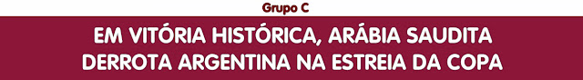 Com a derrota, a Argentina fica de olho no jogo entre México e Polônia, às 13h desta terça-feira. A Arábia Saudita lidera o grupo, com três pontos.